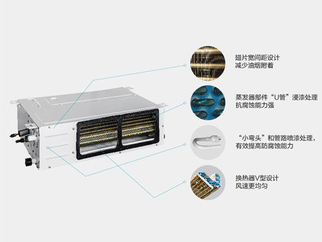 廚享內機采用金色防腐翅片換熱器,抗腐蝕能力強,翅片采用寬間距設計,可減少油煙附著:換熱器采用V型設計,使風速更均勻。 |