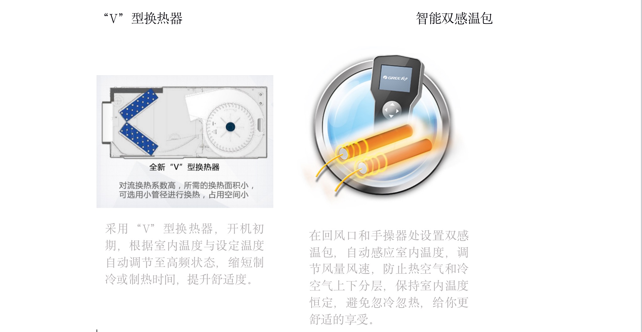 采用“V”型換熱器,開機初期,根據(jù)室內(nèi)溫度與設(shè)定溫度自動調(diào)節(jié)至高頻狀態(tài),縮短制冷或制熱時間,提升舒適度